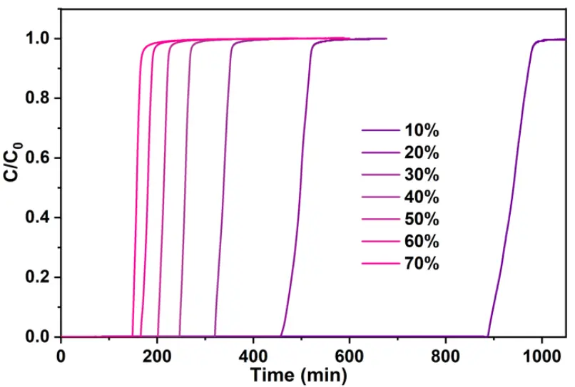 与基于平衡测量的方法不同,突破曲线分析能够直接反映材料在真实动态工况下的表现,因此非常适用于评估用于分离、捕集、催化等领域的材料。在多组分体系中,该方法优势尤为突出,可有效揭示竞争吸附与动力学选择性。通过对突破曲线的精确解析,研究人员能够在紧凑高效的实验条件下,推导出扩散速率、能量异质性以及动态吸附容量等关键参数。