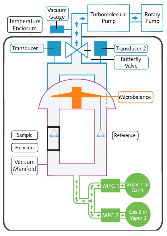 DVS Vacuum 仪器通过组合使用粗抽泵与涡轮分子泵生成所需真空环境。仪器在整个真空腔体内部 (包括样品、压力传感器、蒸汽/气体输送系统及溶剂瓶) 内维持热平衡,使其在整个工作温度范围内(10–70 °C) 均可稳定运行,避免冷凝风险。