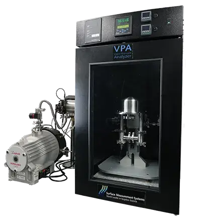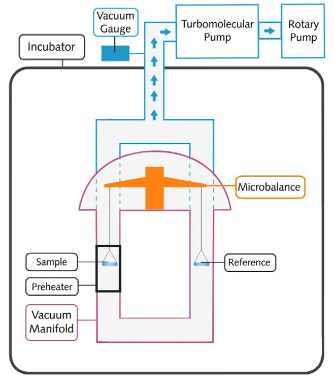 Knudsen 隙透法的原理基于在已知温度下,蒸汽分子通过一个具有已知尺寸的微孔 (位于 Knudsen 池中) 向真空中逸出的速率。该质量损失速率由英国SMS公司专利设计的微量天平 (SMS UltraBalance) 在 VPA 仪器中实时测量。处于热力学平衡状态下的材料,蒸气压是其最基本的特性之一,并且仅受温度影响。