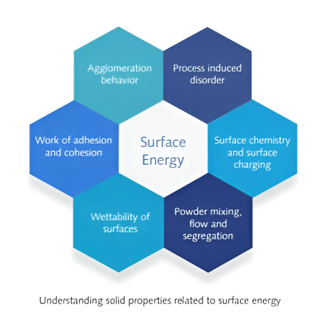 表面能 (包括色散表面能 γd 和极性表面能 γsp) 与固体材料的多种关键特性密切相关,如润湿性、分散性、粉体流动性、团聚趋势、过程诱导的结构无序性、粘附性/内聚性、静电效应、吸附能力及表面化学特性等。